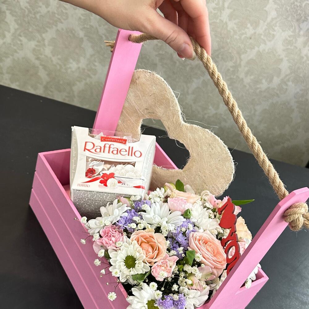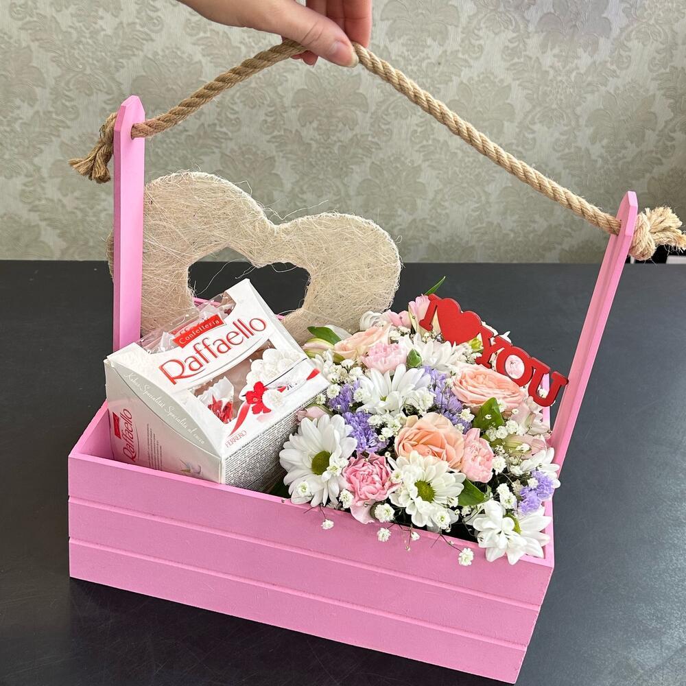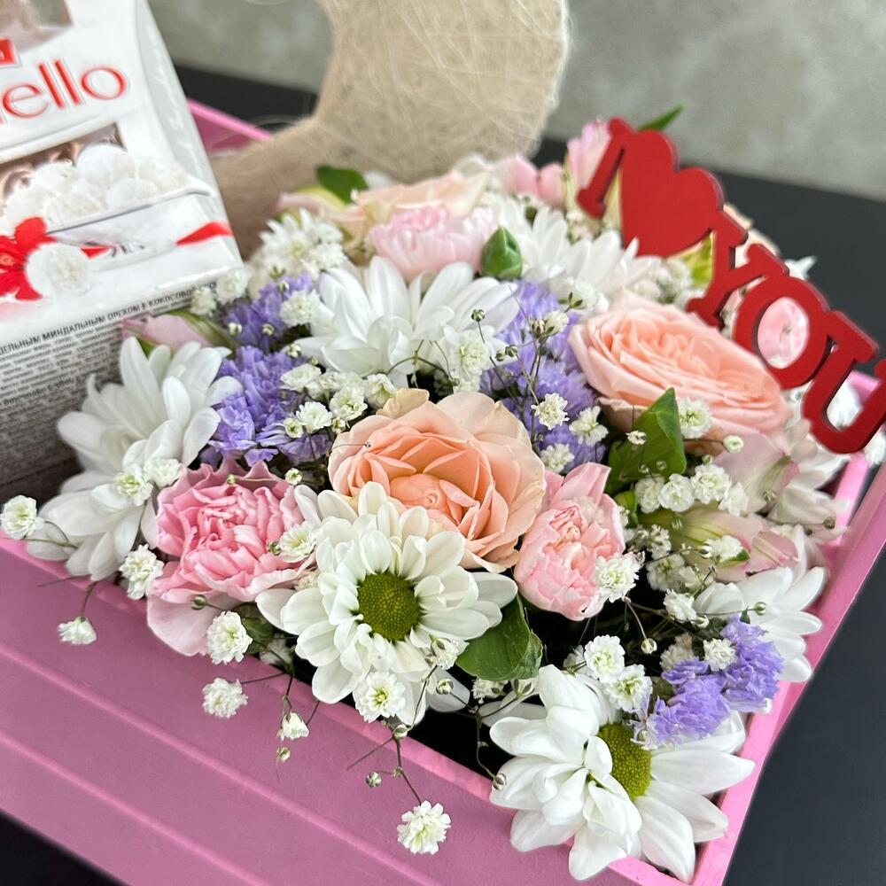Встречайте «Сердечные Изыски» – наш эксклюзивный набор в подарочной коробке, который станет прекрасным сюрпризом для ваших близких в Новокузнецке. Этот букет упакован в стильный ящик нежно-розового оттенка и украшен изысканными цветами, включая пушистые хризантемы, ароматные кустовые розы, невесомую гипсофилу и яркую статицу. Но не только цветы делают этот набор особенным – в композиции также присутствует коробочка изысканных конфет Рафаэлло и стильный декор в форме сердца с надписью «Love You».