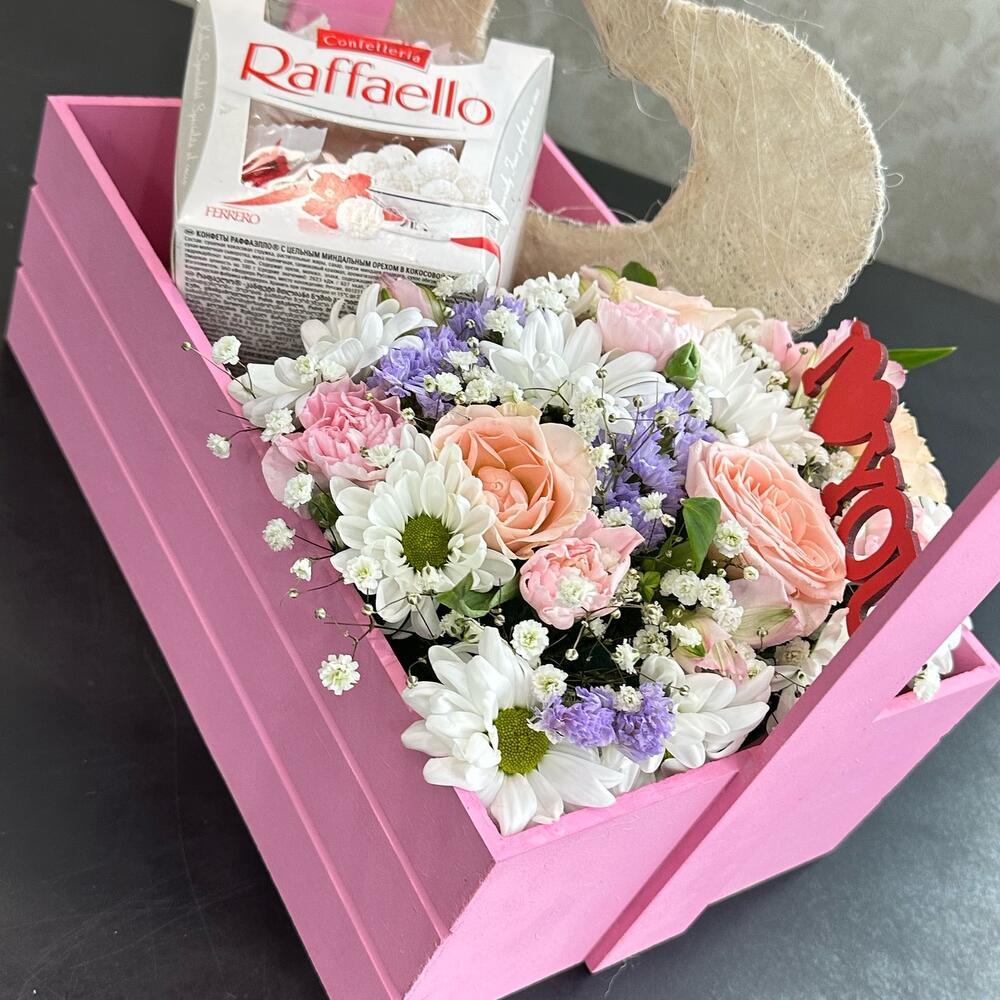 Изысканная подарочная коробка с цветами и конфетами Рафаэлло – идеальный подарок, чтобы сказать «Люблю» в Новокузнецке.
