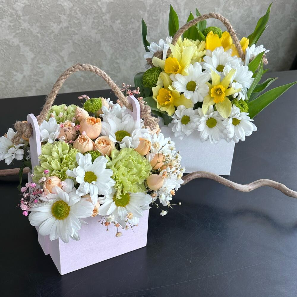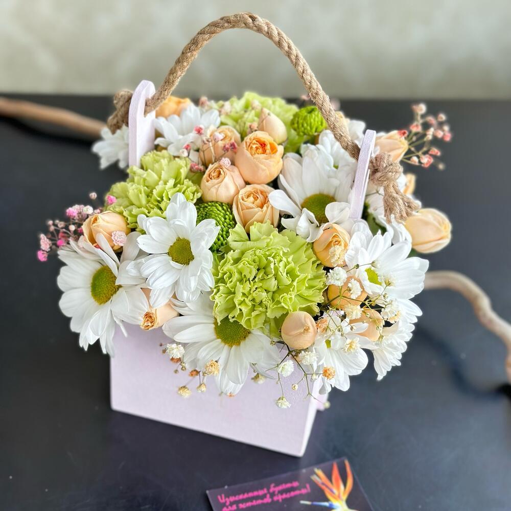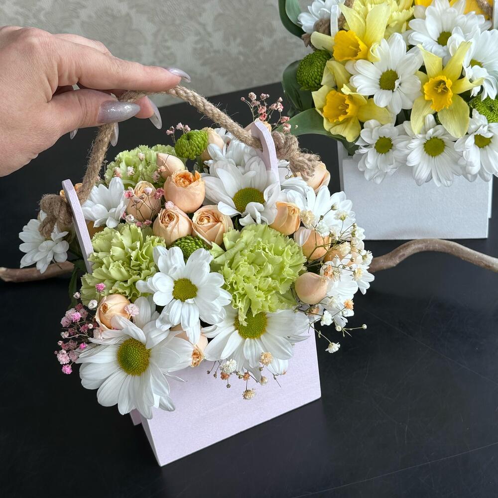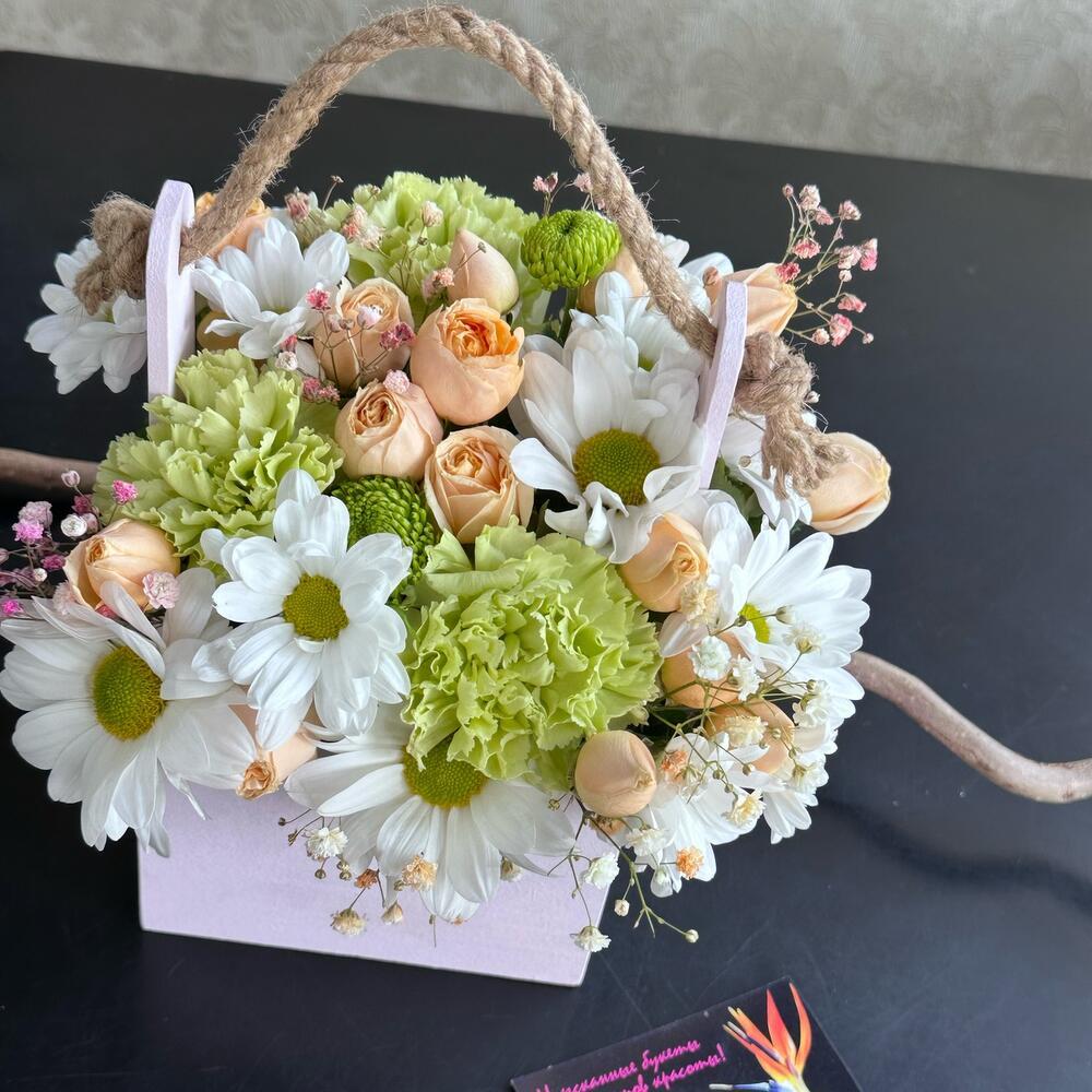 Тегов: 8 марта, гвоздика, зелень, Роза кустовая, хризантема, цветы в корзине