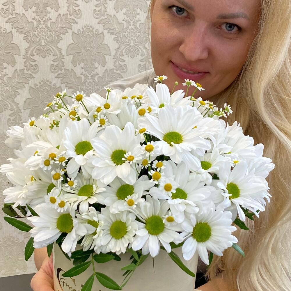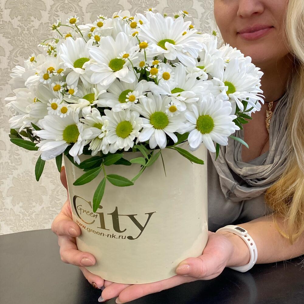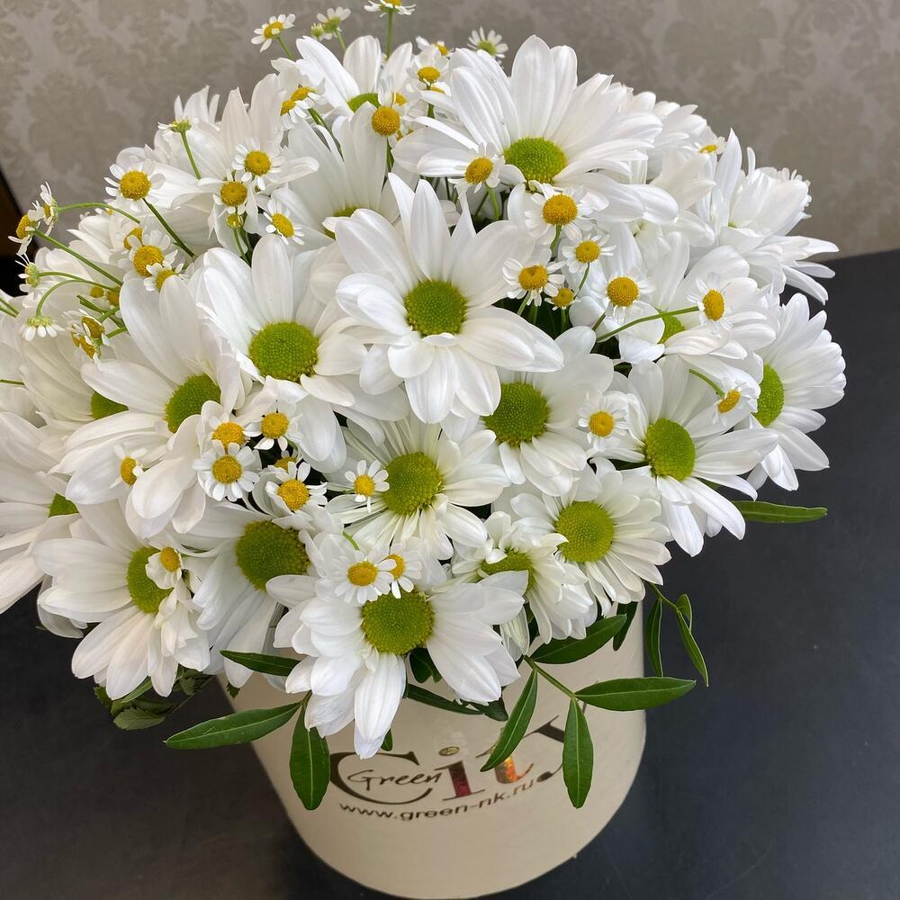 Букет ромашек в шляпной коробке. Хотите порадовать близкого человека стильным и нежным букетом? Букет «Летние ромашки» – это прекрасный выбор для любого случая. В его составе кустовые хризантемы и танацетум, создающие легкую и воздушную композицию. Оформление в шляпной коробке делает его удобным для дарения и долгого сохранения свежести.