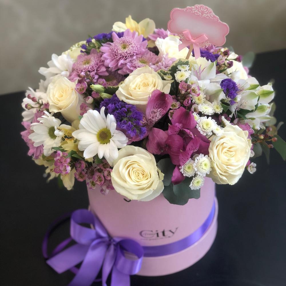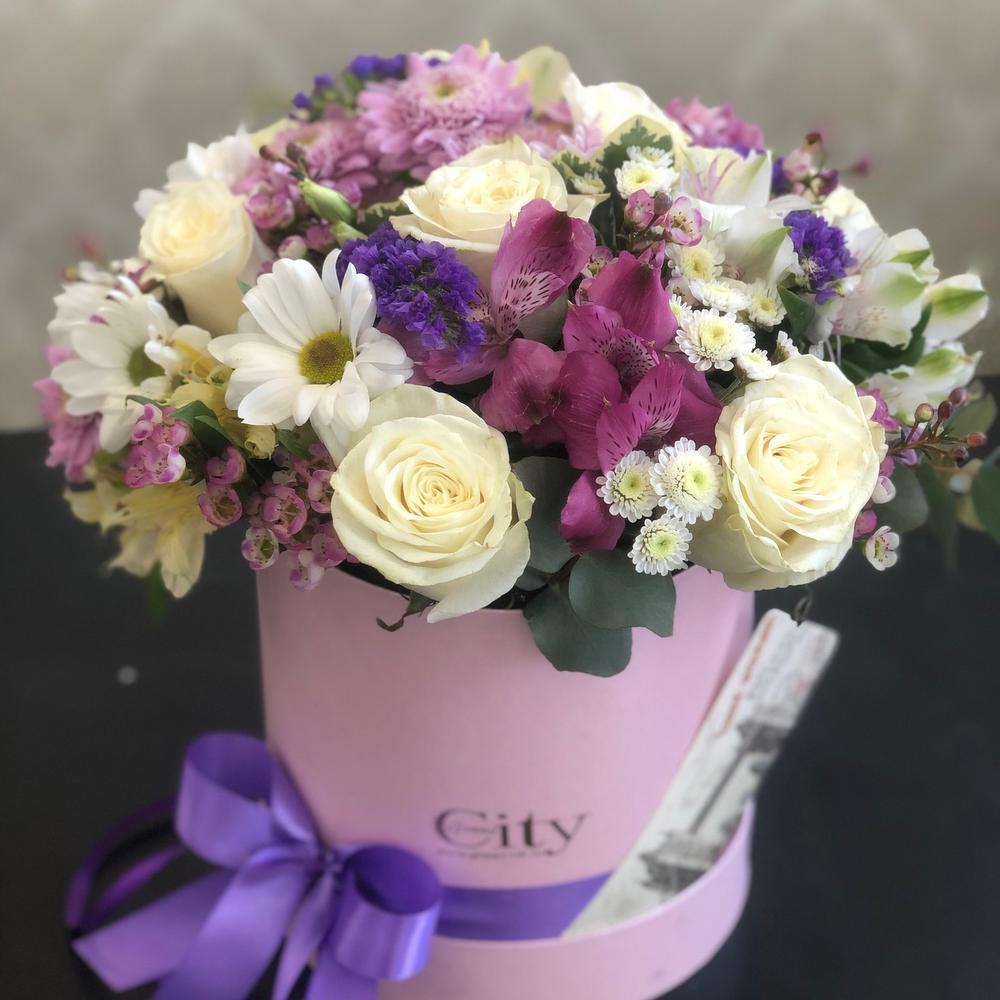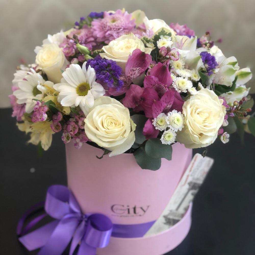 Теги: Альстромерия, роза, хризантема, цветы в коробке