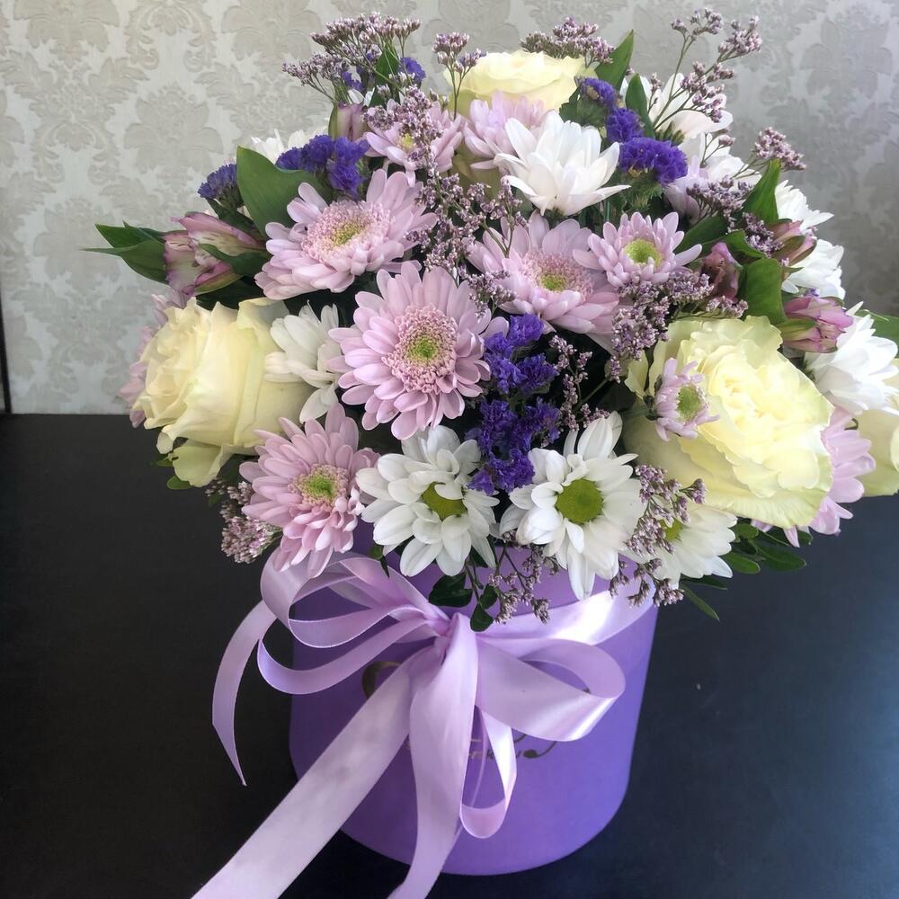 Очаровательный букет «Сиреневые мечты» в коробке — великолепное сочетание белых роз и розовых альстромерий.