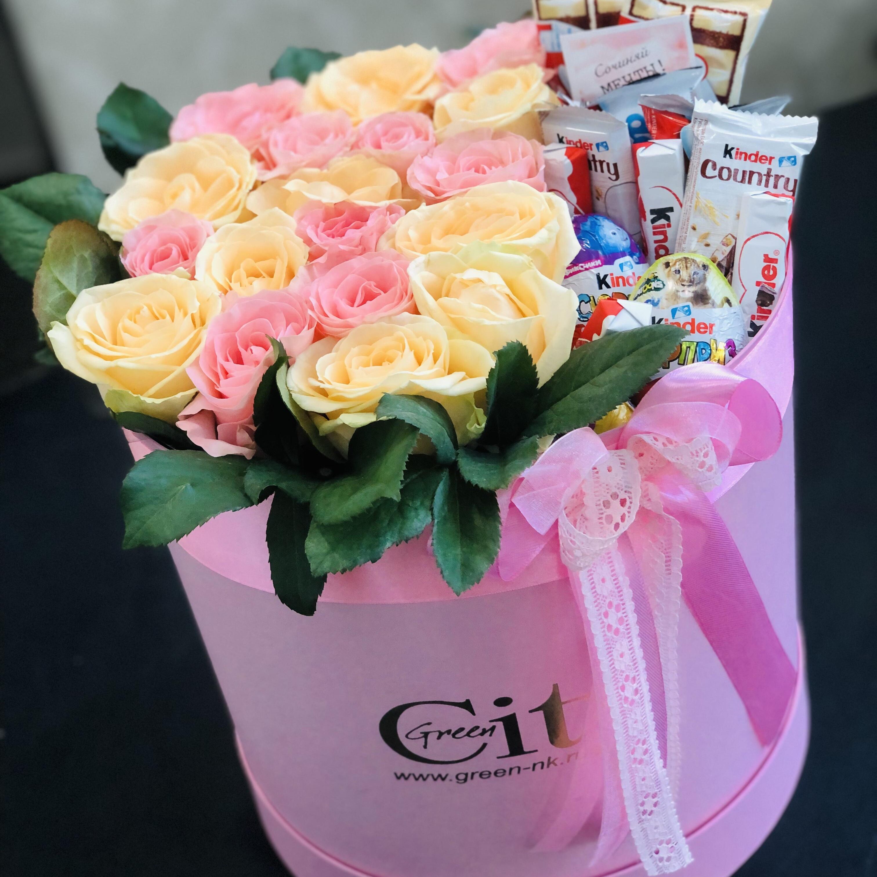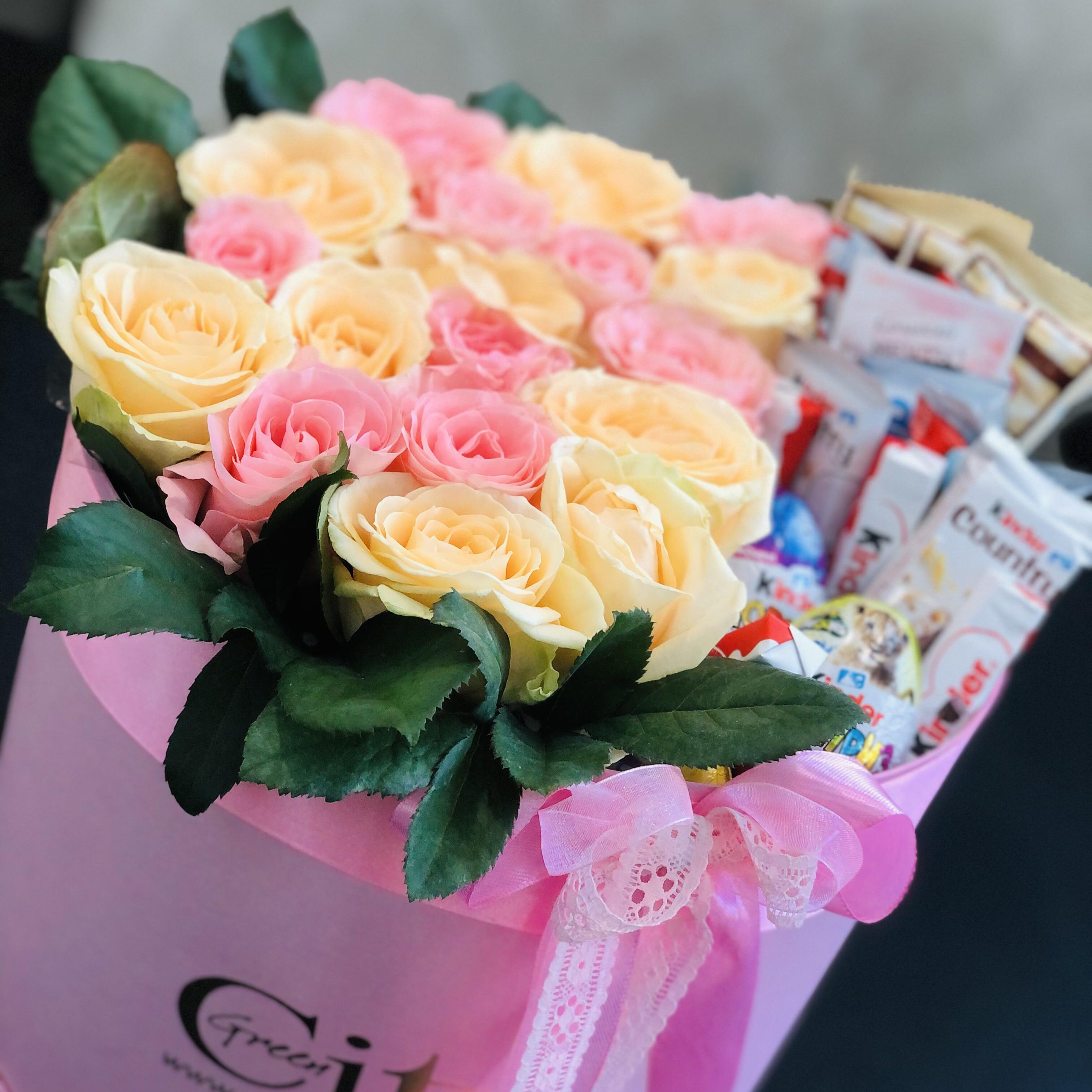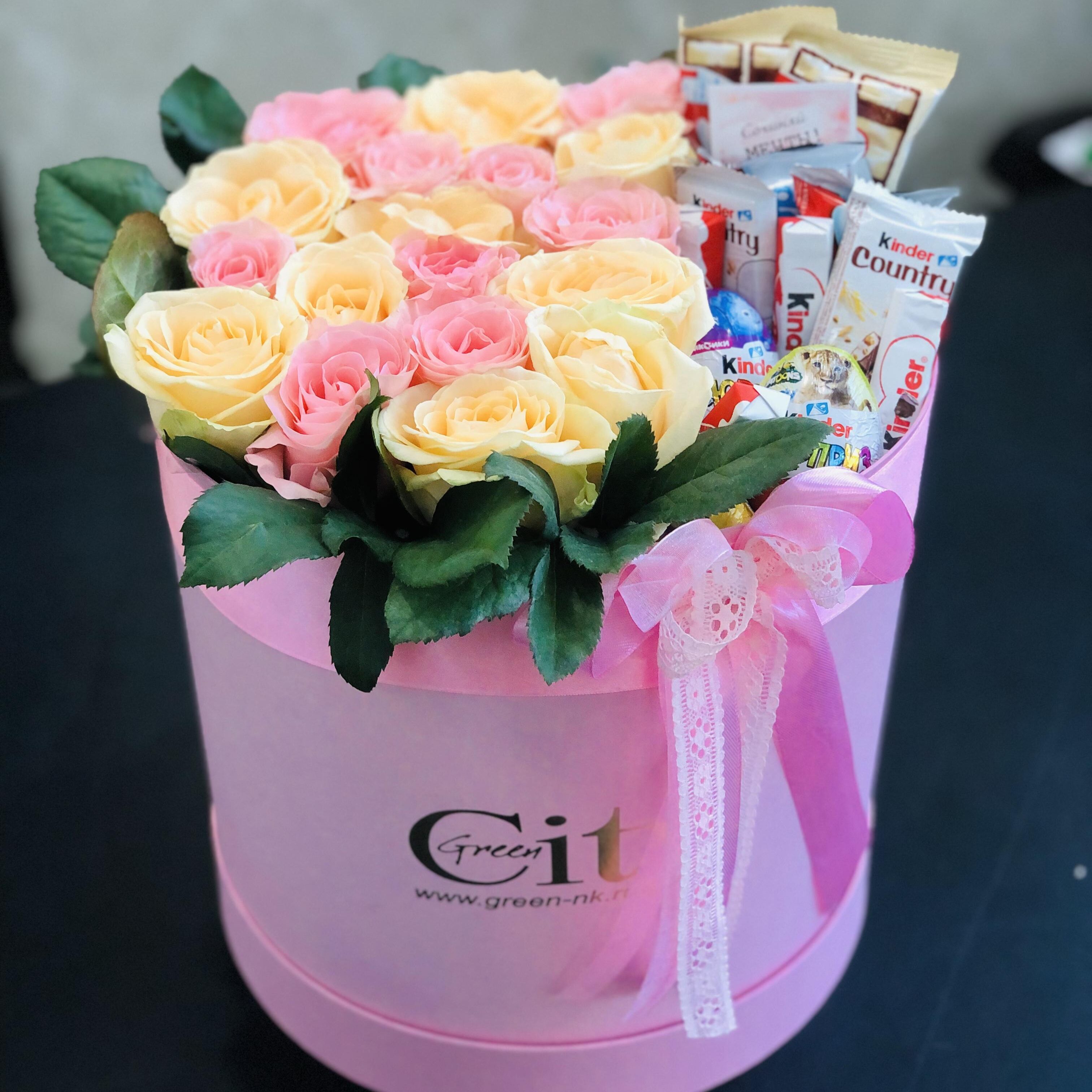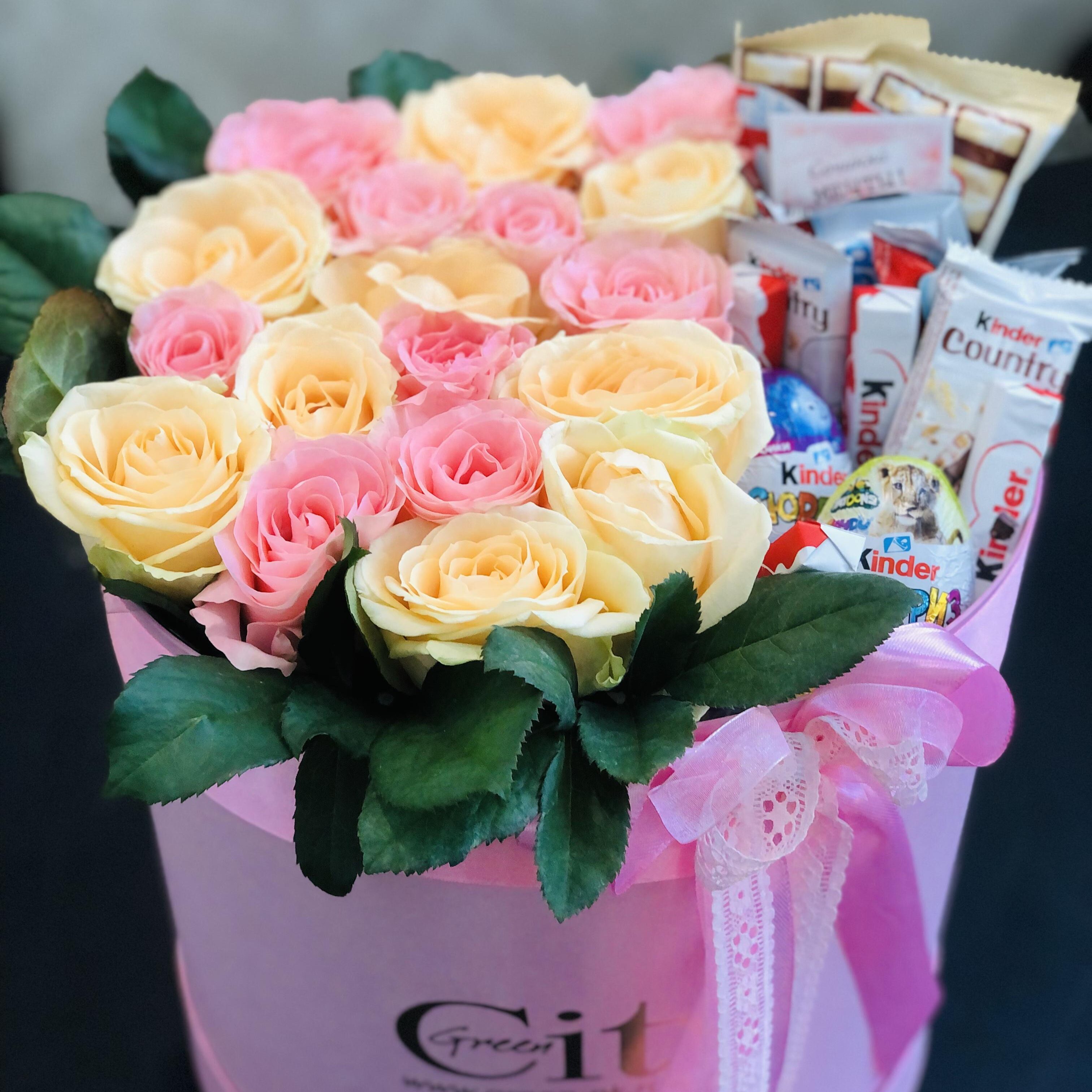 Нежная коробка с розами и шоколадом, киндерами. Сладкая доставка на дом.