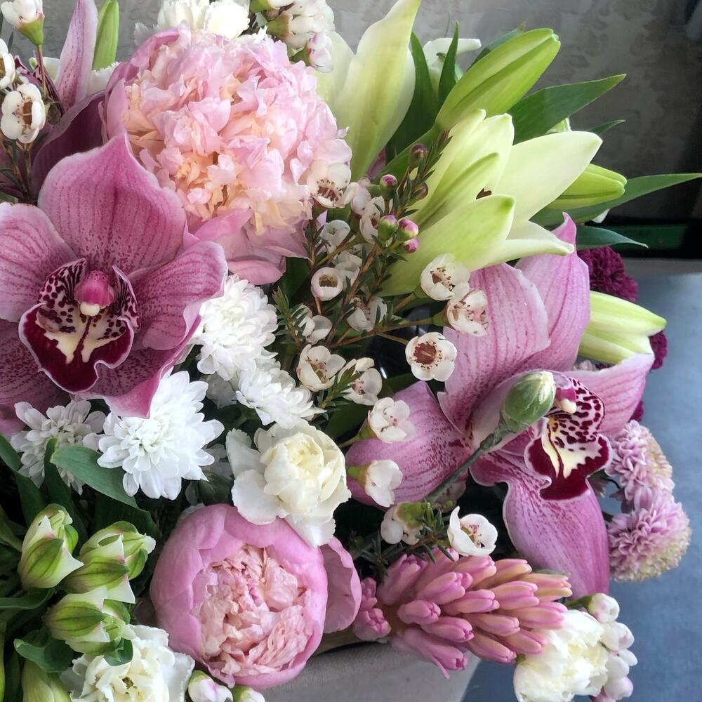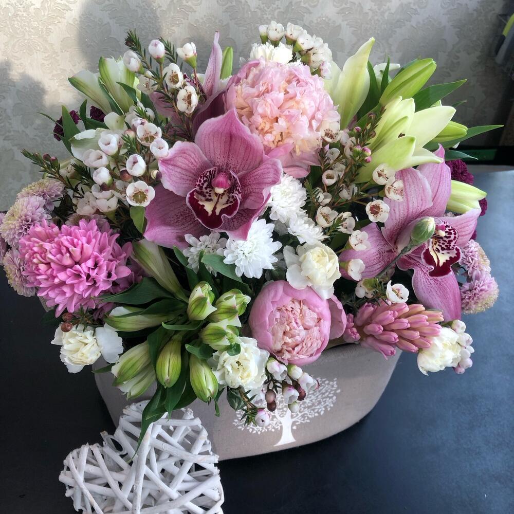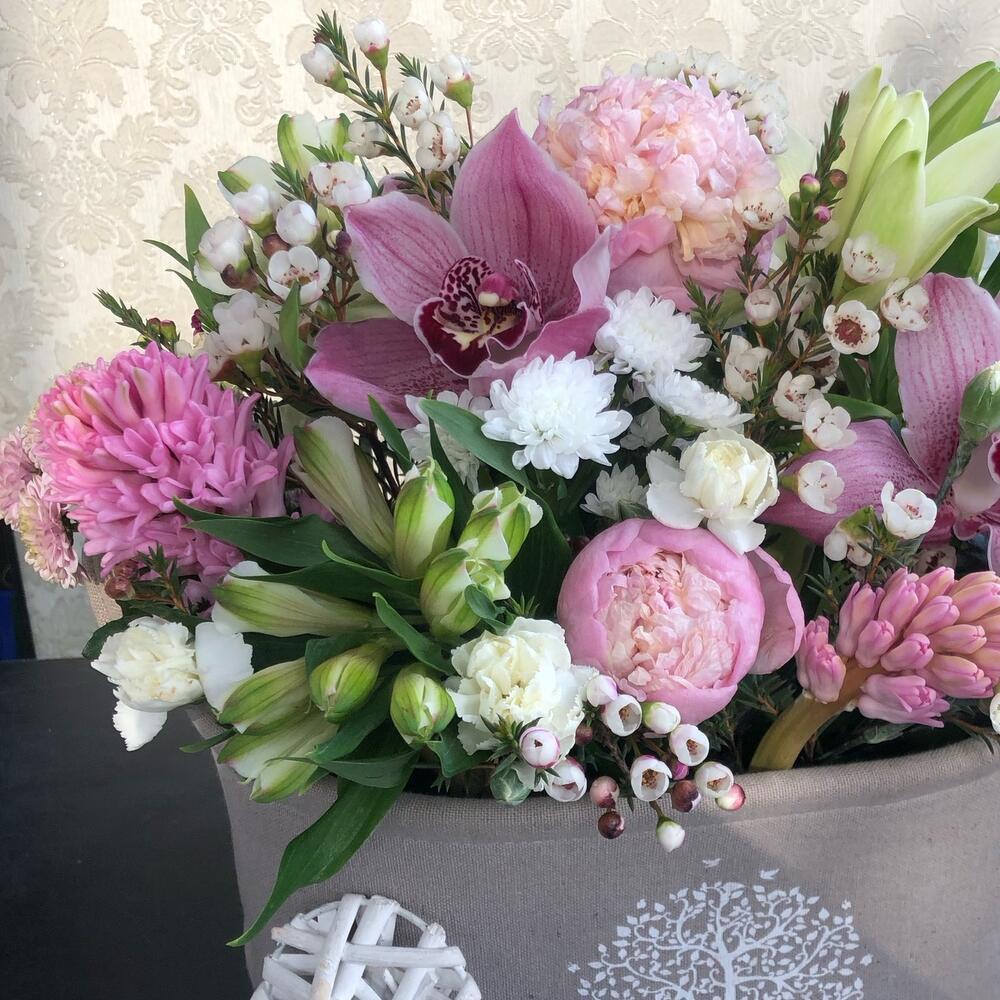Весенняя композиция из цветов «Весеннее чувство» из цветов гиацинтов, розовых орхидей и белой альстромерии: идеальное сочетание нежности и элегантности.