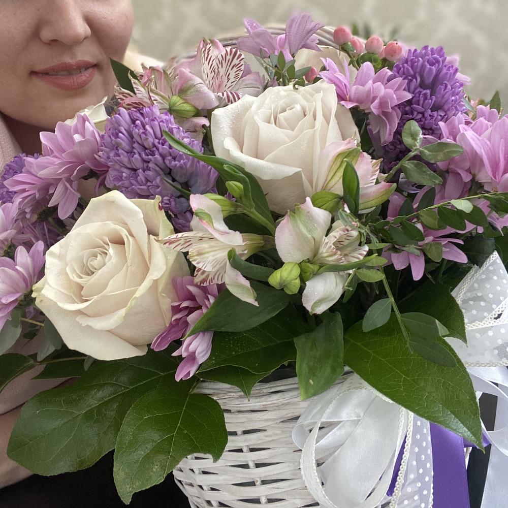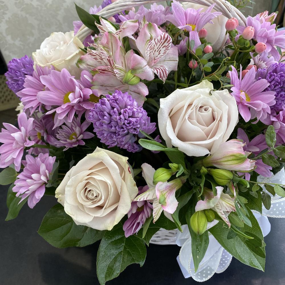Корзина «Теплый вечер» с розами, гиацинтами и альстромериями в сиреневой гамме – элегантный и ароматный подарок.