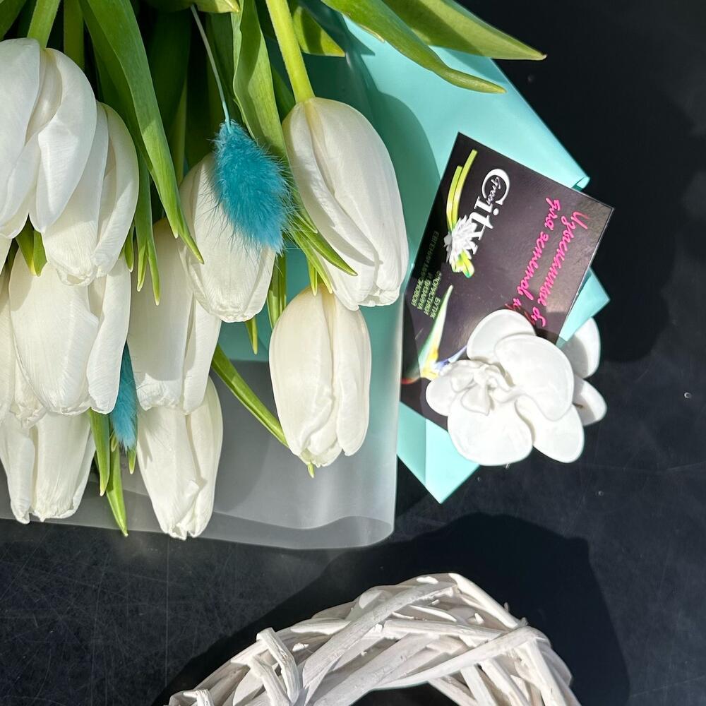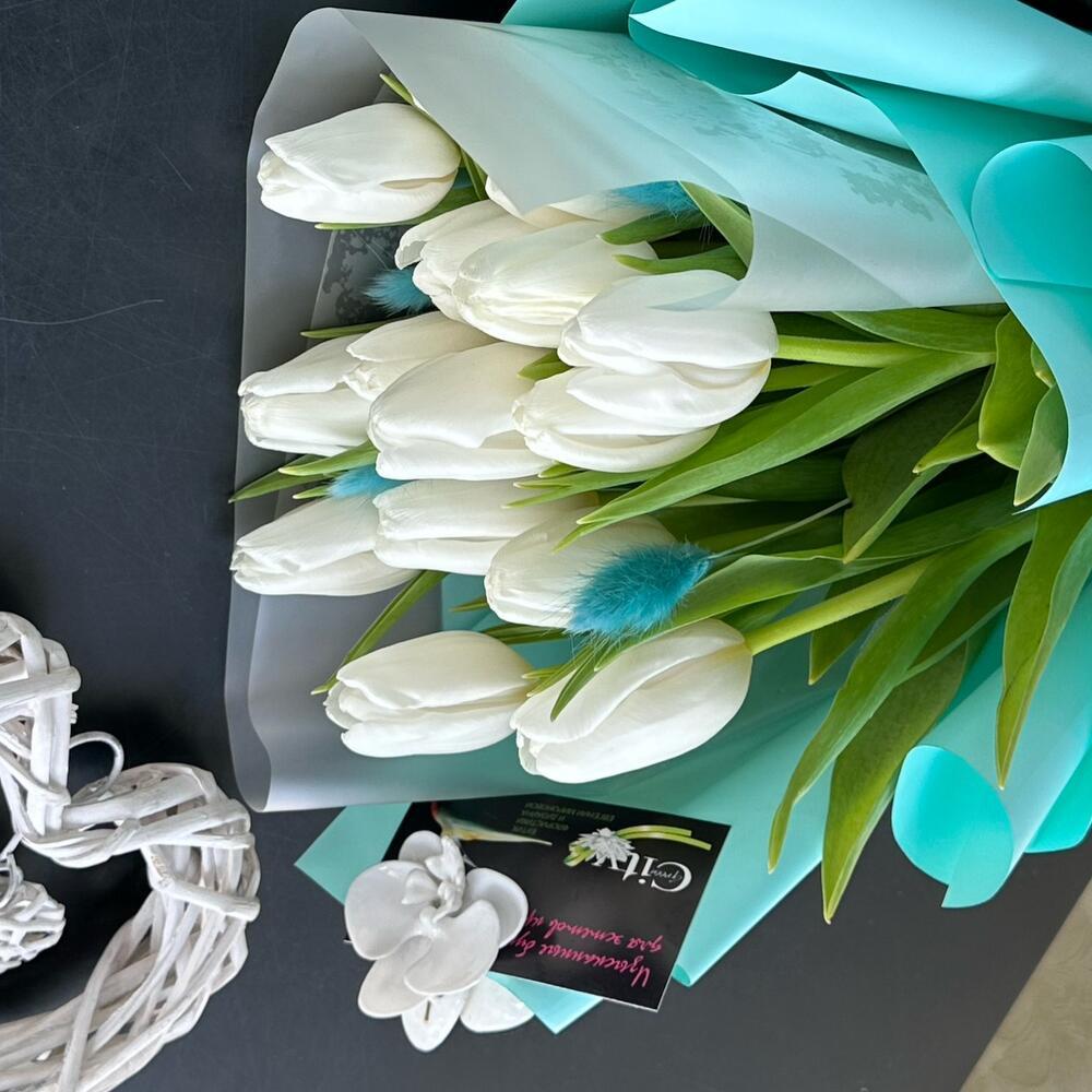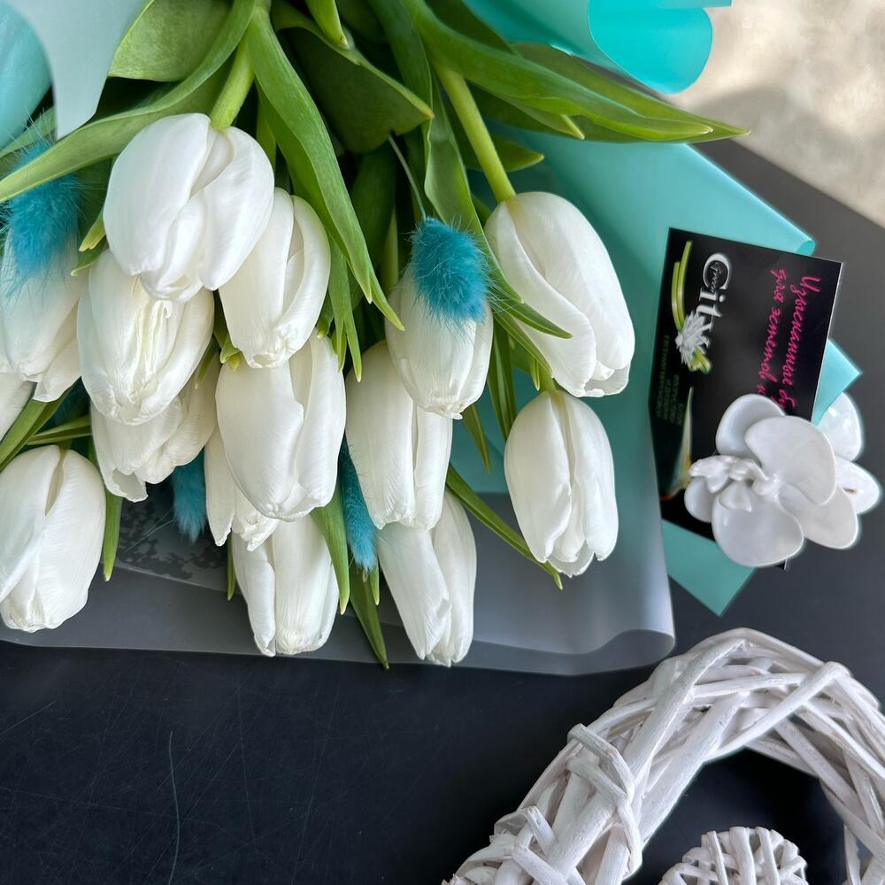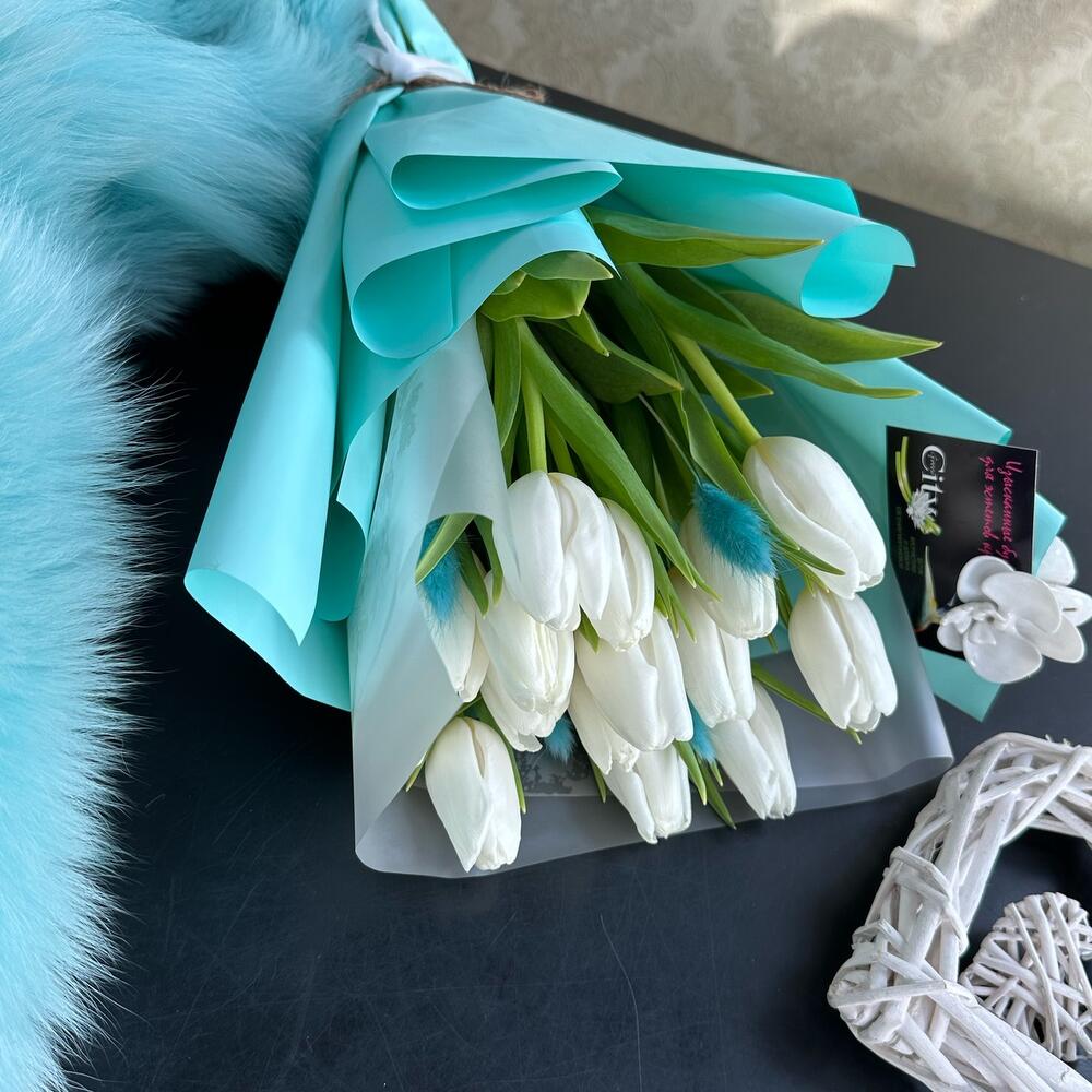 - Наши профессиональные флористы с любовью создают каждую композицию, чтобы подчеркнуть вашу заботу и внимание к получателю. Белоснежные тюльпаны символизируют чистоту чувств и искренность эмоций, а сочетание с яркими акцентами бирюзы добавляет нотку свежести и оригинальности.