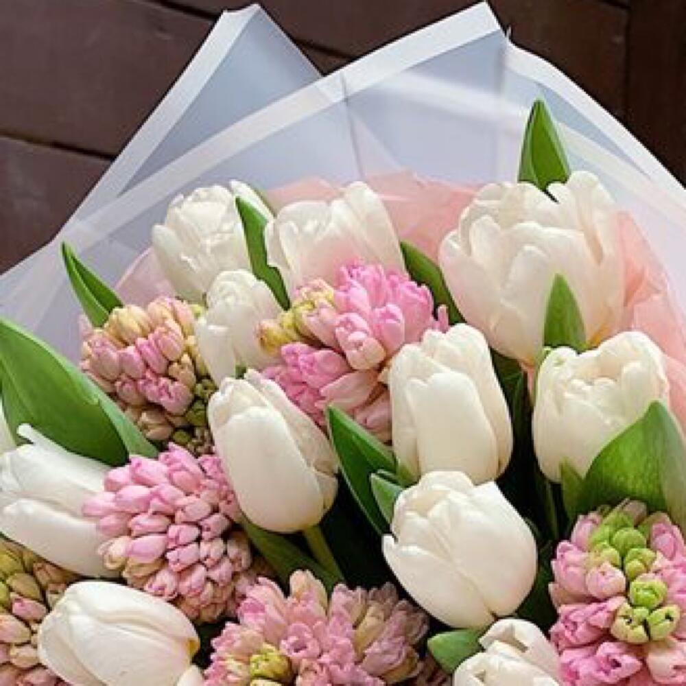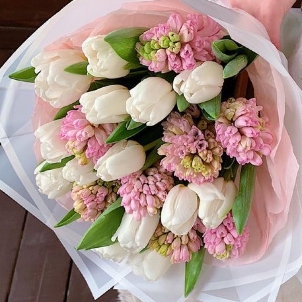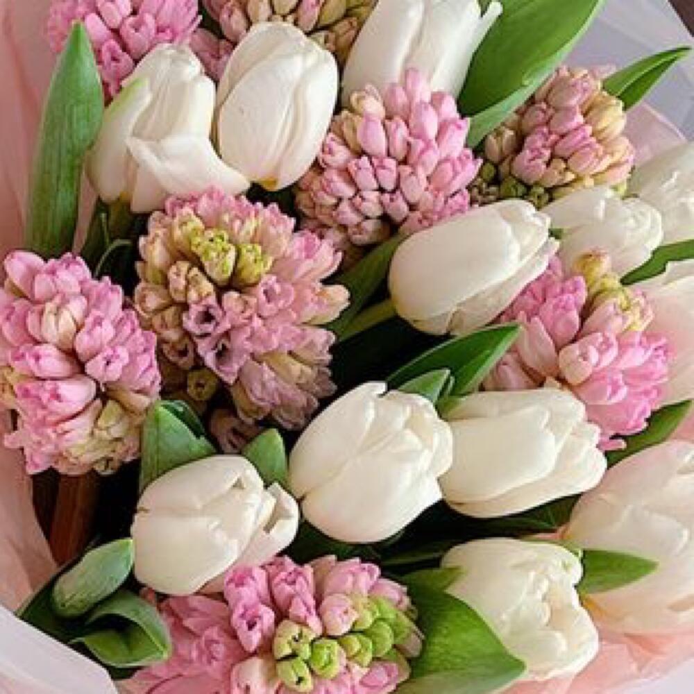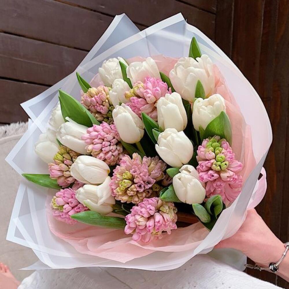 Букет тюльпанов «Зефир» — это нежное сочетание белых тюльпанов и розовых гиацинтов, которое приносит атмосферу весенней свежести и нежности.