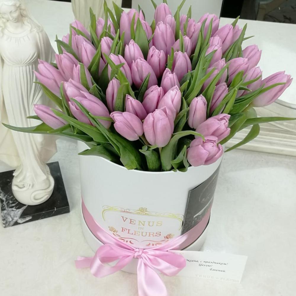 - Позвольте букету «Жасмин» в шляпной коробке из сиреневых тюльпанов стать ярким акцентом вашего праздника или поводом для радости и улыбок.