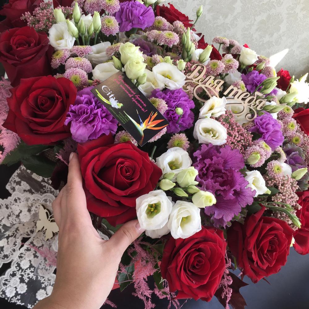| Состав | Брассика, Гвоздика, Зелень, Корзина, Роза, Сантини, Сетак, Эустома |