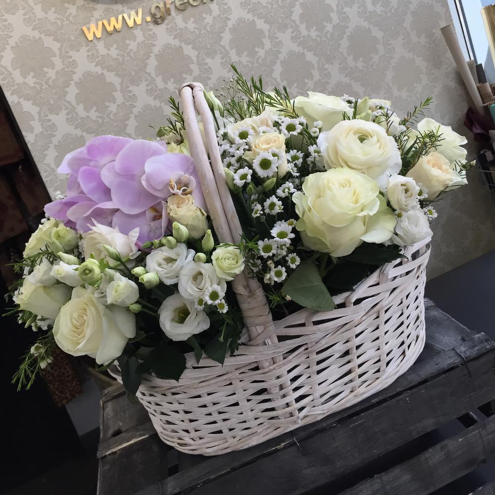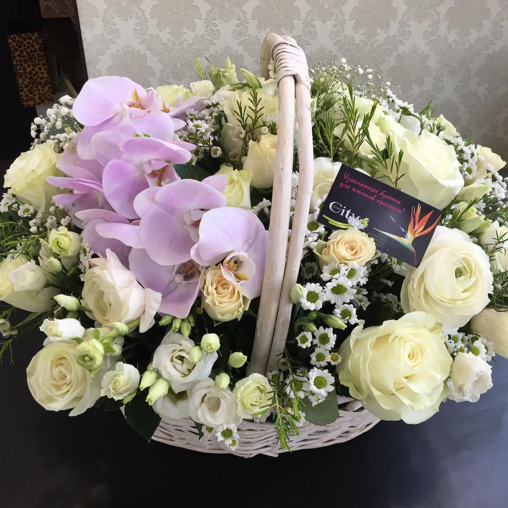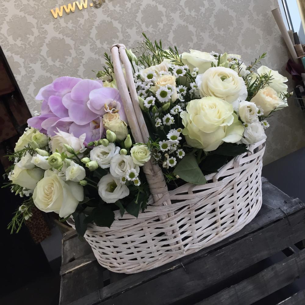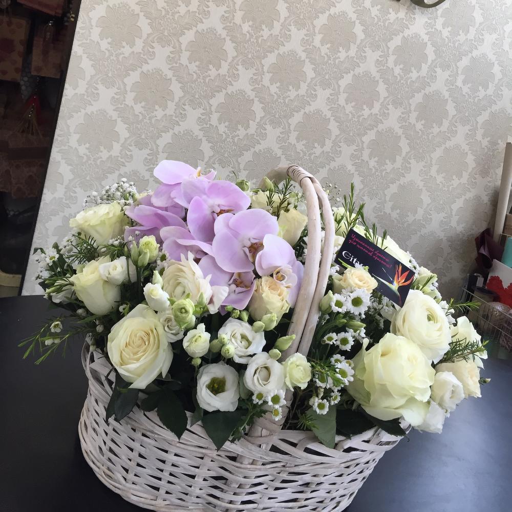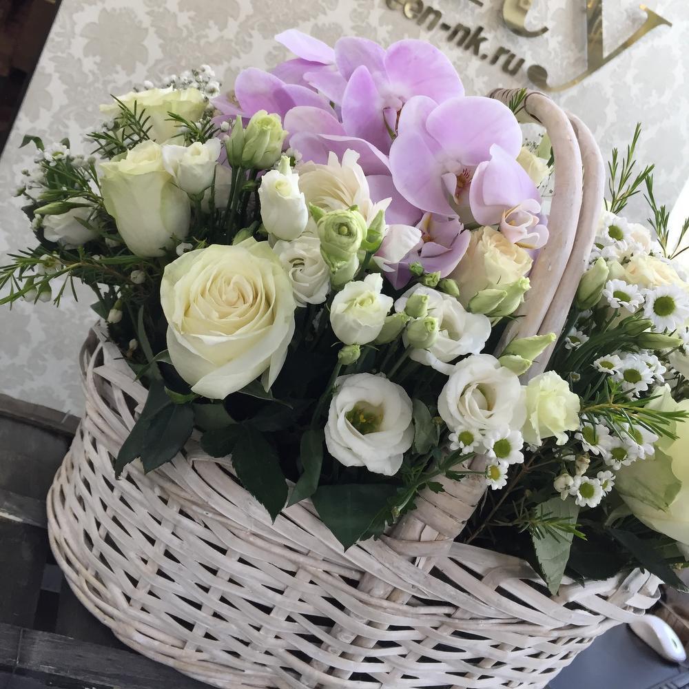Тегов: Орхидея, роза, хризантема, цветы в корзине, Эустома
