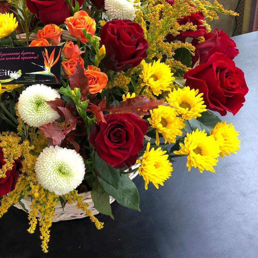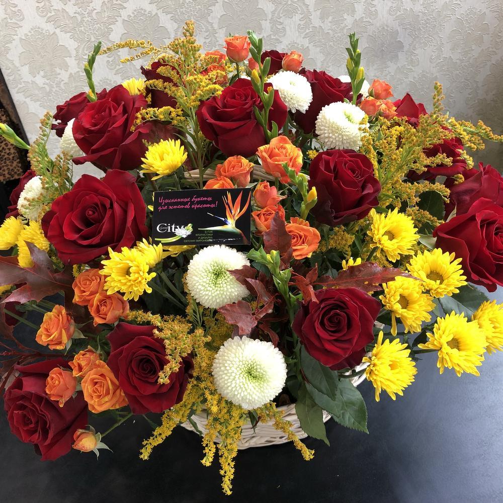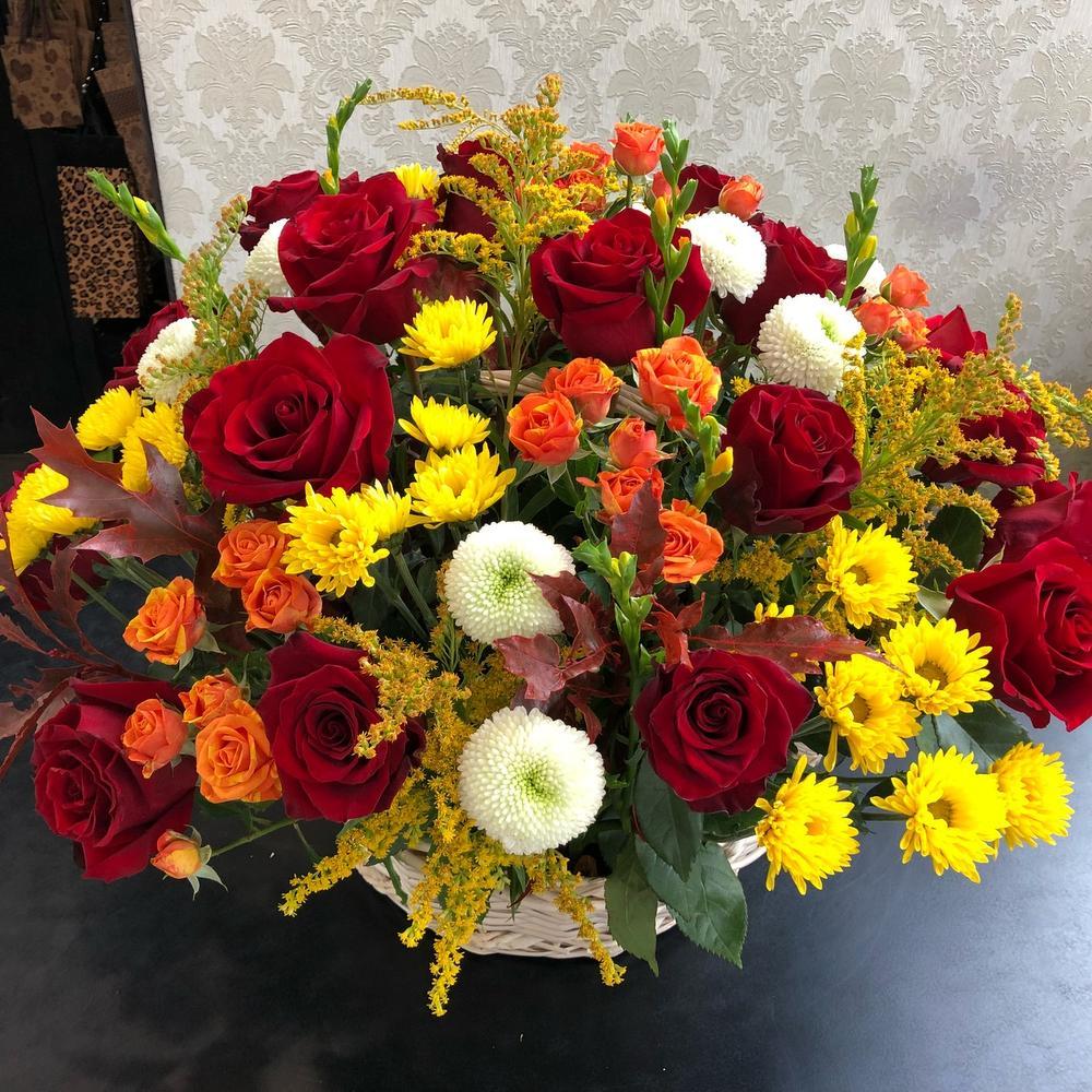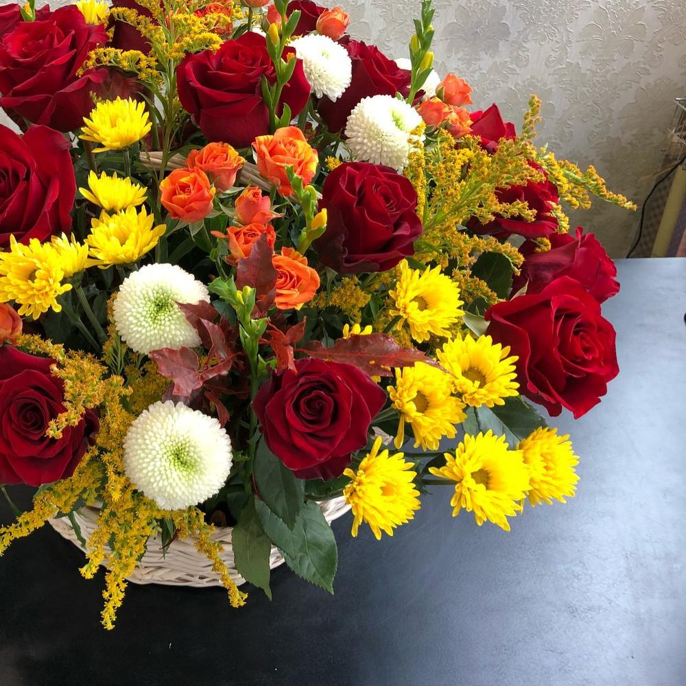 | Состав | Зелень, Корзина, Роза, Роза Кустовая, Хризантема кустовая, Хризантема сортовая |